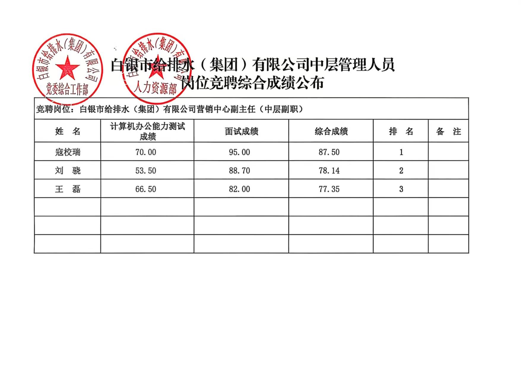 白銀市給排水(集團)有限公司中層管理人員崗位競聘綜合成績(jì)公布